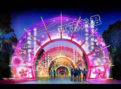 創(chuàng)意說明:以一個個扇形彩燈組成一個通道,每個扇形彩燈設計不同的燈光顏色,展示江南風景的優(yōu)美柔和,造型獨特。